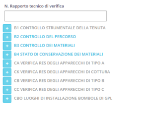 Cliccare sui bottoni contenenti l’icona “+” per aprire l’elenco dei controlli relativi alla sezione di interesse. I controlli specifici per tipologia di apparecchio saranno abilitati solo se sono stati specificati precedentemente degli apparecchi nella dichiarazione. In caso si passi alla definizione delle verifiche effettuate prima di aver specificato gli apparecchi, queste sezioni non saranno abilitate alla compilazione. Una volta specificati tutti i controlli premere “Salva” e proseguire con la compilazione delle schede come visto precedentemente.